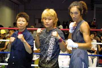 ▼ (8/1 up) ライカの初の凱旋興行にあたる9月18日(土)京都大会の主要対戦カードが決定した。7000人収容会場で、2大世界タイトル戦と2大日本タイトル戦が同時に開催される、日本女子ボクシング協会創設以来最大規模の興行となる。 WIBAからの指名試合でもあるライカ(写真中央)の3度目の防衛戦の相手は、女ロッキー・マルシアノの異名を持つミッシー・フィオレンティーノに決定した。フィオレンティーノは「The Fury(荒っぽい気性の女)」のニックネームも合わせ持つ27歳。フェザー級ながらライト級選手との試合経験もあり、9戦全勝6KOの実績を誇る。 京都出身の袖岡(そでおか)裕子(写真左)は念願のWIBA世界ミニフライ級王者決定戦に挑む。相手は名門バークレー高校で国語の教鞭を取る32歳のインテリ・ボクサー、イボンヌ・ケープルズに決定した。ケープルズの戦績は14戦7勝(1KO)6敗1分。関係者によるとサウスポーから繰り出される左ストレートは芸術的とのこと。高校時代からトライアスロンで鍛え、基礎体力も高そうだ。