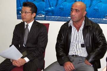 ▼ (2/10 up) 田村潔司が参戦し、アゼルバイジャンの元アマレス王者・アリエフ・マックモド(Aliev Makhmud:写真右)と対戦することが決まった。 マックモドは1970年2月13日生まれでもうすぐ35歳。母国の大会ではフリースタイル68kg級で過去2回優勝したことがあるという。現在の体型は身長173cm、体重87kg。大みそかの男祭りでPRIDEとFILA(国際レスリング連盟)の提携が発表されたのを聞き、FILAに参戦を志願。貿易の仕事の関係でよく日本に来ており、3週間前から来日し、2週間前から高田道場等で練習しているという。いとこのアリエフ・ティモールは昨年11月にDEMOLITIONに参戦し秒殺勝利をおさめている。