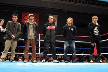 そんな中、石川(右端)は元NKBフェザー級王者のTURBΦに3/18大会の観戦を呼びかける異例の発言。「今日来てるかわからないですけど、TURBΦ選手、見に来てください。知り合いの人、石川がそう言っていたと伝えてください」と話した。 この日会場にTURBΦはいなかったが、後日本誌は直撃取材。全日本の試合をタダで見れることは素直に喜んでいたが、既にMAキック同級王者の大高一郎を下し、IKUSAの-60kgグランプリに向け増量中であることを理由に、全日本キックで3位の石川との対戦には消極的だった。さらに「石川選手、イケメンだからIKUSA向きで悔しいですねぇ。3月のIKUSAも僕の相手募集してるんだから申し込んでくれればよかったのに。どうせならW山本選手や前田選手とかがIKUSA GPに出てきてくれたら、いつでもやりますけどぉ」と逆挑発。茨城弁で飄々とした口調だったが、実績面で劣る石川の挑発にいらだちを隠せない様子だった。(井原芳徳)