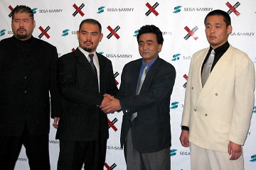 ▼ (5/14 up) パンクラスは13日、元力士による軍団「チーム玉海力」が「パンクラス・チーム玉海力」として活動していくことを発表した。 リーダーの玉海力剛(左2人目)は元大相撲前頭8枚目。昨年5月のPRIDE武士道で総合デビューし、小路晃にわずか18秒でKOされた選手。他のメンバーは元前頭10枚目・大飛翔の小椋誠志(おぐら・せいじ:左端)、元三枚目・玉駿河のジミー明成(あきしげ:右端)の2人。小椋は7/10の横文大会の佐藤光留戦でプロデビューする。 玉海力はPRIDEでの敗戦について「相撲は用意ドンでぶつかるので、逃げると叱られた。曙や小錦の張り手をもらっても大丈夫だったので、パンチぐらい大丈夫だと思っていたら、あんなに簡単に倒れるとは思わなかった」と反省。以降は経営するチャンコ屋には一日に1回顔を出す程度で、格闘技の練習に専念している。練習はP'sLAB東京をはじめ、高阪剛のGスクエア(現在Aスクエアに移転)等に出稽古している。「寝技ははっきり言って下手糞です」と玉海力本人が語るように、まだまだ発展途上のようだが、パンクラスの尾崎允実社長は「パンクラスの原点の無差別級の戦いを彼らには引っ張って欲しい」と新しいパンクラスの仲間に期待を寄せた。(井原芳徳)
