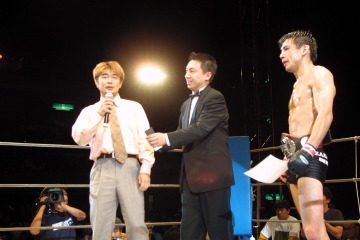 ▼ (7/13 up) 62kg契約3回戦・秋本じん vs. 大石真丈の元同門対決が追加され、全カードが決まった。 両者は以前K'zファクトリーで同門だったが、02年に秋本が秋本道場JUNGLE JUNCTIONを主宰し袂を分かった。同年9月の横浜文化体育館大会で、当時フェザー級王者だった大石が初防衛戦後、秋本との試合を呼びかけ、秋本も了承(写真)。一時は両者の対戦が行われるかに思われた。しかし、1年後に大石が王座から陥落するなど紆余曲折があり、3年越しの約束を大石が果たし今大会で実現する。対する秋本も男と男の勝負に異論はなく62kg契約での試合を快諾した。この試合は単なる元同門対決というだけではなく、この3年間に歩んできた道や、思いがぶつかり合う、互いに一歩も引けない一戦となるだろう。