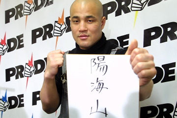 ▼ (1/15 up) 昨年6月にPRIDE参戦を表明した元プロボクサーの西島洋介が、リングネームを「陽海山(ようかいざん)」に改め、PRIDE.31でプロ総合格闘家転向初戦を行うことが決まった。DSEはマーク・ハントかマウリシオ・ショーグンの2名に相手を絞り込んでおり、1週間以内に正式決定する予定だ。 東京・青山のDSEで15日会見した陽海山は「相手が誰であれ頑張ります」「ボクサーじゃなく総合格闘家としてリングに上がりたい」と静かに意気込みを語った。 新しい名前はPRIDEオフィシャルサイト等を通じ募集し、3000通を越える応募の中から選ばれた。元々「洋介山」を「ようかいざん」と読み間違えられることが多く、本人にとってその響き自体に違和感がなかったという。画数も占った結果、その3文字となった。 日本では全力でパンチを打つ練習がしにくいことから、陽海山は高田道場での練習仲間のユン・ドンシクと共に、来週からシアトルのAMCパンクレイションへ出稽古に向かう。デビュー戦の相手の人選について、高田延彦PRIDE統括本部長は「かませ犬とやってもしょうがない。あえて厳しい相手をぶつけることで、どれだけやれるか、どれだけ厳しいリングか、彼にとっての勉強になる」と説明した。