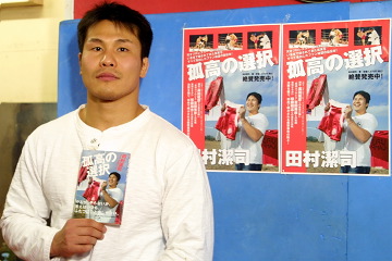 ▼ (2/16 up) 田村潔司が川崎市のU-FILE CAMPのジムで16日記者会見し、アントニオ・ホドリゴ・ノゲイラ戦に向けての意気込みを語った。(写真:新著「孤高の選択」をアピールする田村) 両者は00年のリングスKOKトーナメントで対戦しているが、田村は「前に戦った時とは立場が逆転した。今は僕が100%チャレンジャーの立場」と位置づける。対策は「あまり考えない。体で覚えた動きで臨機応変に対応する」というが、ノゲイラについては「手も指も長いので、手首とかを簡単につかまれてしまう。ポジショニングや関節を取るポイントも1センチ差とかの世界になる」と評し、「向こうはいっぱい型を持っている。それにいかにハマらないか」が勝負の鍵となるとの見方を示した。 無差別級GPについては「今回満足できる内容だったら」と話す一方、「オファーをもらっていないし、どちらかといえば出ない方向。現時点では考えていない」と消極的だった。しかし前日のPRIDE武士道の会見で、高田延彦PRIDE統括本部長が構想を示し、田村に参戦を呼びかけたウェルター級の日本人トーナメントに関しては、田村の口から消極的な言葉が出てこない。この話は初耳だったようで「全く考えていなかった」と前置きしたが、ウェルター級の83kgリミットは「ベストぐらい」だといい、「自分の視野を広げられるのであれば今後そういう方向も見えてくる」と参戦に含みを示した。(井原芳徳)