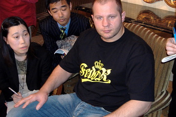 ▼ (2/25 up) PRIDEヘビー級王者・エメリヤーエンコ・ヒョードルが、PRIDE.31に出場するローマン・ゼンツォフとともに来日。都内ホテルで24日に行われたルールミーティングの後に記者の質疑に応じた。以前から痛めていた右手親指付け根を大みそかの男祭りの後に手術し、金属プレートを抜くまでパンチが打てないことを明かし、「完治はいつかわからない。治らなければ5月のGP開幕戦には出場できない」と話した。10数針縫ったといい、写真でもその痕がわかる。DSEの広報担当者は「5月には出て欲しい。通常の人間と違いヒョードルなら回復すると思う。だが状態次第で2回戦へのシードというアイデアもある」と語った。 アントニオ・ホドリゴ・ノゲイラはライバルのヒョードルとは対照的に「100%回復した」と好調をアピール。03年から痛めていたという左肘を05年6月の試合後に手術。復帰戦となる田村潔司戦に向けてサウスポー対策に重点を置いたが、「体格差は関係ない。試合で大事なのは自分の磨いてきた技を出すことだ」と話し、己との戦いとなることを強調した。手術は「06年が大事な年になることを意識した」決断。GPではジョシュ・バーネットとの対戦を希望し、「彼となら面白い試合ができる」と話した。そのジョシュは10kg以上減量し110kg台まで落ちたといい、ヘビー級トップ集団の再起に注目だ。