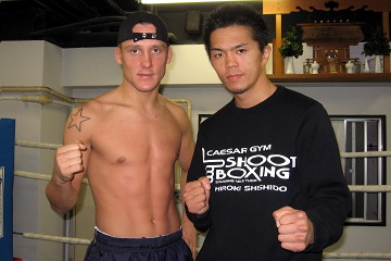 ▼ (5/26 up) オーストラリア人のイアン・シャファーとポール・スミスが24日来日。最終調整のために25日、東京・浅草のシーザージムを訪れ、次々とパワフルなショットをサンドバッグに叩き込んだ。練習後はたまたま居合わせた宍戸に、対戦するシャファーが「グッドラック」と笑顔で握手を求める余裕すらあり、緊急出場ながら好調な仕上がりを見せた。 シャファーは、「ルールもエキサイティングだし、明日の試合が待ち遠しいよ。宍戸をKOして、もう一度HERO'SでKIDに挑戦するから見逃すなよ」と自信のコメント。緒形健一と対戦するポールも「緒形を倒せば日本で名前が売れる。そのチャンスを掴みに来たんだ。だから明日は絶対にKOで勝つよ」と気持ちは高ぶっている。(情報提供:シュートボクシング協会)