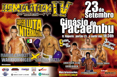[海外キック] 9.23 ブラジル:新田明臣、カノレッティと対戦▼ (9/20 up) 幾多のリングで試合をしてきた新田明臣が、ブラジルのサンパウロで23日(日本時間24日)に、マルフィオ・カノレッティと対戦する。カノレッティはブラジル国内のミドル級での試合は過去負け無し。新田は10年以上もサンバデジャネイロの入場曲を使っており、念願かなって遂に本場ブラジルでの試合となる。(情報提供:バンゲリングベイ) DEMOLITION Fight " IV"