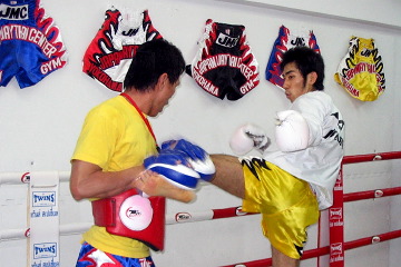 一方のJMC横浜ジムは、今回が初めての公開練習ということもあり、寺岡義洋代表が練習のポリシーやメニューを解説する内容中心に。ジム名の「JMC」はジャパン・ムエタイ・センターの略で、その名の通りムエタイがベース。寺岡代表が自衛隊、目黒ジム(現・藤本ジム)、 タイのゲオサムリットジム等で学んだことがミックスされ、体力と基礎技術の向上に重点を置いているのが特徴だ。 スパーリングをパンチオンリー、あるいは蹴りオンリーと分けるのは、ゲオサムリットジムと同じ。パンチと蹴りを混ぜたゲーム形式のスパーを選手同士にいきなりやらせることは無い。むしろタイ人トレーナーらとのミット打ちの中で攻防を学んで行くことに重点を置いている。この日は大輝と佐藤皓彦がパンチのスパーを行った後、それぞれミット打ちを披露。両者とも力強く軸のブレない攻撃で、調子の良さを印象づけた。