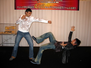 ▼ (11/16 up) マジック界の革命児・Cyril(セロ)さんが、ワールドGP決勝戦の開会式でマジックのパフォーマンスを行う。セロさんは16日、東京・白金で記者会見。タイでの2週間の練習から帰ってきたルスラン・カラエフの打撃を、ガオグライ顔負けのバックスウェーでかわす、イナバウアーならぬ「セロバウアー」を披露。カラエフに伝授すると豪語した。さらには賞金プレートをその場で現金に変えるパフォーマンスも。東京ドームでは、もっと大がかりなパフォーマンスで観客を驚かせる。