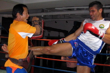 ▼ (11/24 up) ワールドGP決勝トーナメントに出場するルスラン・カラエフが23日、東京・代官山の伊原道場にて公開練習を行った。 ルスランと伊原信一会長は1年前からの知り合い。今月上旬にタイに10日ほど練習に行く少し前から、伊原道場に通うように。タイでは蹴りや防御を中心に練習。伊原道場での会長の指導にも心酔している。 そのため準々決勝で戦うグラウベ・フェイトーザが「いくつものパターンを想定している」と話していた件を伝えても、「あまり対策を練らない方がいいよ。僕は常に新しいスタイルで戦っているから」と答え、動じる気配は無い。ルスラン以外のGP出場メンバーはみな30代。若いルスランは試合ごとに進化していても不思議ではない。 この日は大誠塾所属でK-1のフレッシュマンファイトにも出場している力丈相手に2Rのボクシングのスパーリング、伊原会長相手に2Rのミット打ちを行った。力丈には視界から消えるロングフックを何発も叩き込み、伊原会長を前蹴りで豪快に吹き飛ばす。 伊原会長は「ルスランはよく動けて度胸もいい」と素質を絶賛。「秘密だけど、2つぐらい練習している必殺技がある」とを明かし、「小さいルスランが1戦1戦勝ち上がり、ドラマを作って欲しい」と期待を寄せた。(井原芳徳)