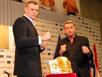 ▼ (12/1 up) K-1ワールドGP決勝大会の前日会見が1日、都内ホテルで行われた。明日の大会は昨年の90ヶ国を大きく上回る129ヶ国で放映。会見場となった大宴会場には、世界各国から数多くのマスコミや関係者が集まった。 準々決勝最高の注目カードは、昨年覇者・セーム・シュルトと、ジェロム・レ・バンナの一戦。バンナが「明日はまず一番高い山に登ってタイトルに辿り着きたい」とシュルトを意識する発言する一方、シュルトはバンナを「ワン・オブ・スリーにすぎない」とクール。研究はしたが、特別な作戦をも立てていないとも話す。だが準々決勝での体力消耗を危惧し、ステップマシン等を使った体力増強に重点を置いてきたといい、バンナ戦を重要な山と捉えていることは確かなようだ。 ルスラン・カラエフは、故郷の北オセチア共和国の首都・ウラジカフカスから親族4人と友人らが多数応援にやってきたことを話した。モチベーションの高い状態で、GP初制覇を狙う。 会見にはスーパーファイトに出場する選手たちも出席。バダ・ハリは臨席したレイ・セフォー、ピーター・アーツと談笑する一方、「前回の大阪大会では感情的になり迷惑を掛けたことをお詫びしたい」と優等生的な一面も見せた。 大会の模様はフジテレビ系にて当日夜9時より放送。オープニングファイトは4時にスタートする。(井原芳徳)