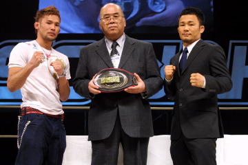 ▼ (2/19 up) 修斗世界バンタム級王者・BJが、1位の漆谷康宏相手に初防衛戦を行うことが決まった。ライト級2試合・佐藤ルミナ(世界2位) vs. アウグスト・フロタ(スイス/欧州2位)、門脇英基(環太平洋8位) vs. ウィッキー聡生(環太平洋10位・06年新人王MVP)も追加された。いずれも17日のパシフィコ横浜大会で発表され、公開調印式も行われた。 BJは昨年10月の横浜大会でマモルを下し王座を獲得後、わずか5か月で防衛戦を行う。1年の防衛期限ギリギリまで王座戦をやらない選手が多い中、「リスキーな方が自分も楽しいし勉強になる」と大会パンフのインタビューで話すBJ。しかも怪我が無ければ今年は全ての後楽園大会に出ると表明しており、王者になっても攻めの姿勢は崩さない。 漆谷は03年12月のマモル戦以来となるタイトルマッチ。BJとは05年の9月に引分けている。 漆谷は「3年間挑戦を待ったので、この機会を…」と言った後、「とりあえず頑張ります」と話し、思いのたけを全て試合にぶつける姿勢を示した。BJは「僕は相手とかを気にしないタイプ。自分を出し切りたい。漆谷選手は凄く上手い選手。相手に不足はない」と抱負を語った。