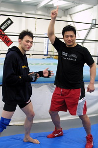 一方のチェ・ヒュンソク(下写真左)は今回の試合に向け、1か月半で10kgも減量したせいもあって、公開練習ではあまり激しい動きを見せず。総合はアマで2戦、プロは初めてと経験は浅く、技もまだ荒さが目立つ。だが師匠のチェ・ムベ(写真右)は「私のチームで激しい練習を積んで来た。逃げ出す選手が多い中、彼は4年間耐えて来た」と発言。韓国の選手は気持ちの強い選手が多く、ヒュンソクも精神面では侮れない選手のようだ。 今回の相手・坂口征夫の試合映像はまだ見ていないが、弟・憲二が出演したフジテレビの月9ドラマ「プライド」は韓国で見ていたという。「有名な選手をKOして日本で名を売りたい」とモチベーションは上々だ。(井原芳徳)