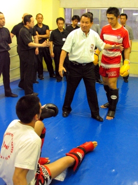 これはJPMCのレフェリー&ジャッジのライセンス取得希望者を対象に行なわれた会で、JPMCやムエタイに興味を持つ多くのレフェリーやジャッジ、あるいはその希望者が12名参加した。 講習会のために招かれたのは、アネック・ホントンカム氏(65歳:写真中央)。アネック氏はもう30年以上、タイでムエタイを裁き続けているムエタイの番人。現在はWBCムエタイ審判部長、7チャンネルのムエタイ相談役を務める傍ら、国内外でプロボクシングのレフェリーも務めている。また、シドニー工科大大学院を卒業するなど、学識豊かな“インテリ・レフェリー”だ。