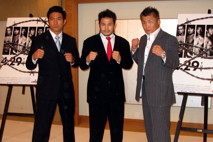▼ (3/27 up) DREAMミドル級GP一回戦・桜庭和志 vs. アンドリュース・ナカハラ、田村潔司 vs. 船木誠勝、デニス・カーン vs. ゲガール・ムサシの3試合が決定した。 ナカハラは極真会館ブラジル一撃アカデミー所属の25歳。極真会館の05年世界ウェイト制中量級優勝者。総合はデビュー戦で、フランシスコ・フィリオの元で総合の練習を積んでいるという。 桜庭と船木は27日、桜庭の新道場である東京・品川区のLaughter 7で記者会見。GP参戦を拒否していた桜庭は、GP参戦とこのカードが笹原圭一DREAMプロデューサーの口から発表されると、道場の隅で「え?」と声をあげ、寝耳に水といった様子。谷川貞治FEG代表が「おめでとう」と声をかけると、FEGのスタッフも揃って拍手し、会見発表という形で出場が既成事実化されてしまった。桜庭は「ここ(道場)を会見に使うと聞いて鍵を開けに来ただけ。かさぶたは治ったけど、反対の足が痛いので、まだ出るかわかりません」「完全に騙してますよ。皆さんが帰った後、凄く揉めると思います」とGP出場拒否の態度を貫いた。 船木は「去年大晦日の復帰戦で全く何もできず終わり悔いが残った。必ず何か爪痕をリングに刻みたい」「UWFで戦った仲間と戦えて感慨深い」「でもUWFにいたのは19年前の話。全く違う人と戦う感じ」等と話した。 今大会の模様はTBSにて深夜放送される予定。ゴールデンタイム中継ではなくなるが、PRIDE時代のようなスカイパーフェクTV!でのPPV生中継復活に向けて調整中だという。 3/15のDREAM.1のライト級GP一回戦で無効試合となったJ.Z.カルバン vs. 青木真也の裁定の扱いに関しては、PPVの件、ライト級GP二回戦のカードと合わせて、来週発表されるという。(井原芳徳)