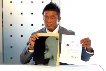 ▼ (4/21 up) 秋山成勲が大晦日のやれんのか!の三崎和雄戦で負傷した左膝と鼻骨を再び痛め、ミドル級GPを欠場することになった。代替選手およびGPの残り1カードは未定だ。 東京ドームホテルで21日に記者会見した秋山の説明によると、9日の打撃のスパーリング中、鼻にパンチを受けたところ、出血が止まらなくなり、翌日にレントゲンを撮った結果、三崎戦で痛めたのと同じ箇所を骨折していたことが判明した。 「トーナメントには何が何でも出たかった」という秋山は、回復の道を模索しつつ、対戦相手に鼻の負傷がバレないようにするため、大会を主催するFEGの谷川貞治代表には膝の負傷のみ報告した。しかし18日の再検査で全治3週間と診断され、医師からは「少し打撃が当たっただけでも鼻血が出てすぐにドクターストップになる状態」と宣告され、欠場を決めた。左の写真で秋山が持っているのはレントゲン写真と医師の診断書だ。 6月大会の二回戦からの主催者推薦枠は設けない方針を主催者側は明言しており、秋山のGP優勝の道は完全に途絶えた。この処遇について秋山は「当たり前だと思う。事情が変わって枠ができても出ない。一回戦から出たかった」と語った。ただし通常のワンマッチへの出場には意欲的で、6月頃の復帰に向け「自分のできるあらゆる手を使って治したい」と話した。 ちなみに秋山は、GPに出たかった理由について「自分が戦いたい3人のうち、1人がトーナメントに出ている」と話した。それは桜庭和志か?という質問には「ご想像にお任せします」とだけ答えた。(井原芳徳)
