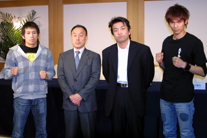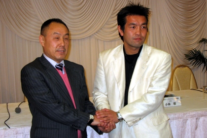 ▼ (4/1 up) 全日本キックの小林聡ゼネラルマネージャーが1日の都内での記者会見で、初のプロデュース興行のコンセプトについて語った。(写真左は全日本キックの金田敏男代表) 「お祭りじゃなく、肉を奪い合って食い合うような戦いの場にしたい」「全日本キックにとってこの大会が起爆剤になって欲しい。俺が出しゃばらなくても済むような、こういう大会をもうやらせないぐらいの選手が、この大会から出て欲しい」というのが小林GMの基本ポリシー。出場選手、カードは未定だが、「4月大会の石川×元気で生き残った方は必ず出す」と明言し、「団体を問わず、ギラギラした選手が名乗りをあげてもらえれば」と話した。 最近では藤原ジムの後輩の山本真弘がK-1トライアウトで合格し、5/31の新宿大会の全日本キックvsチームドラゴン・全面対抗戦が全試合K-1ルールで行われることが決まる等、K-1関連の話題が増えている全日本キックだが、小林GMは「あくまでキックボクシングルールでやりたい」とこだわりを見せる。 「現役をやめても、小林聡をやめたわけじゃない」とも話した小林GM。口には出さなかったが、既にいくつかのカードの構想が頭の中にはあるようで、マッチメイカー・小林聡の手腕に期待したい。(井原芳徳) 小林聡GMプロデュース興行を開催