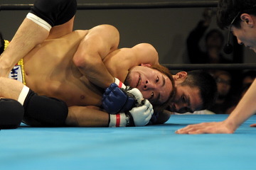 序盤こそロシアンフックで突進して来た佐藤に倒され下になってしまった飯田だが、ブレイクがかかりスタンドに戻ると流れは一転。今度は先にテイクダウンし素早くパスガード。アームロックを狙い続け、最後は腕十字に移行し逆転勝ちをおさめた。