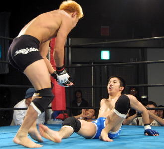 石井が115kg、折橋が100kgと、日本人には珍しいヘビー級同士の対決。石井が折橋をテイクダウンし顔面に豪快なヒザを連打すると、折橋は大量に鼻血を出しドクターチェックが入る。再開したものの、折橋がコーナーに石井を押し込んでいる最中に折橋の出血がひどくなり、レフェリーストップがかかった。