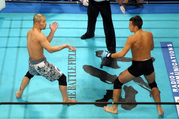 交代した矢野は低いタックルから、今成同様モリカビュチスの足に絡みつきにいくが、取りきれず、逆にアンクルを深追いした隙を突かれて、ボディにパンチを何発も浴びせられる。 再び両軍選手交代。今度は今成がスタンドの距離の取り合いで、矢野まがいの半身の構えや、カンフー映画風の奇妙なポーズを見せ、客席の笑いを誘う。ムキになってパンチで飛び込んできたスタンコスを見切って、その場でのスライディング風に体を沈ませた今成は、そのままスタンコスをやり過ごして、魔法のようにその足に絡み付いていく。引き込みとシザースの複合技のような動きである。足を取られたスタンコスはそのまま前に倒れこんで、裏十字を取られるような形になる。たまらず場外に逃げてしまい、それを故意のエスケープと判断した和田レフェリーがイエローカードを出す。 スタンドに戻ると、なおも「東洋の神秘」風に低く構え、先ほどの“引き込みシザース”を狙った今成の顔面を、一瞬早くスタンコスのハイが襲う。モロにヒットはしたもの、足は取った今成が自軍コーナーでスタンコスのアンクルをひねりあげる事に成功。1R終了直前に1本目を先取した。これでリトニアチームはスタンコスが試合権を喪失、2-1のハンディキャップマッチとなった。