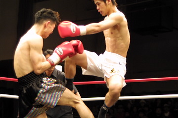 サガットペットはラジャダムナンの現役王者で、昨年の三菱トーナメントライト級覇者でもある強豪。序盤から伸びのある左のミドルとハイでAVISを脅かす。AVISは大きなダメージを負うことはないが、なかなか前に踏み込めず、結局最終ラウンドまでそういう状態が続く。5Rにはサガットペットがステップを踏んだり口笛を吹いたりしてAVISを小馬鹿にする始末だった。