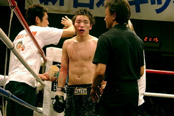 1Rに右目尻をカットしてしまった深津だが、出血はそれほどでもなく試合を優位に運び、3Rに右ストレートでダウンを奪う。だが4Rは踏み込みが足りず、5Rには全のローとハイに苦戦。試合が終っても深津の表情から笑顔は見られなかった。