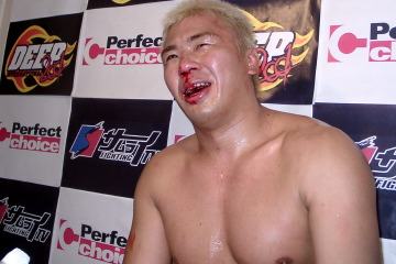 「(試合の感想?)正直、そこ(本調子)まで追い込めなかったけど、やっぱりトレーニングをしたただけのことはありました。(上山選手は?)上手い。あとやっぱ重く感じましたね。いつも重い人とはやってないから。練習では周りは軽量級ばっかだから。彼も絞ってはいて、動いてんだけど。でも俺もまだまだ捨てたもんじゃないな、と思いました。勝った後(所属ジムの師匠の)桜田さんの現役時代みたいに『♪男だったら〜』って大声で歌おうと思ったんだけど、それは本当のマッハに戻って第1戦に歌いたいと思います。 (1Rからよく動けてましたね?)動けてた?動けなかったよ。やっぱりちょっと前とは違うよね。いろいろな原因はあるけど。精神的なことももちろん。でも俺の持ち味で、いっぱいあるけどね、5、6個あるんだけど、そのひとつだけの持ち味で勝てたから。皆さん、見て分かるとおりですよ。もっともっといけますよ。もっとどんどん寝技だけでも、抱え込んだりだとか、タックル切って後ろに回ってバックついて、チョーク狙ったりだとか、皆さん、知ってるよ、俺より。俺も分かってるけど。まぁ、一つの持ち味だけで勝ててよかったです。 (久しぶりの勝利が大きな喜びに?)そうですね、喜び。この間の12月の時とはちょっと違いますよね。やっぱりねぇ、いつも思うけど、もっともっと試合しないと(体調は)戻らないですね。どこでもいいですよ。修斗だけだったらね、栄冠の頃にはね、ちょっとまた違うね。(オファーがあれば?)やる、やる。やって戻す。それが今年1年の目標です。今回、勝って嬉しかったけど、正直勝てると本当は思っていなかったよね(笑)。でも勝てたんで。 (勝てると思っていなかった理由は?)気持ちはもちろん強いんだけど。ほら、試合前に『負けたらどうしようか』と色々考えるけど、いつも俺はそんなこと考えたことなかったよね。でも考えるようになってきちゃったね。ちょっとずつ。だからバカじゃなくなってきたなぁと思って。バカみたいにガムシャラにやるのが一番いいんだよね。猪木さんも言っていたけど『バカになれ』って。でもまだまだ俺も捨てたもんじゃないな、と今回で分かりました。バリジャパのときアウドロ・ビクトリアーノに折られた歯に差した歯がまたスパーリングで折れちゃったので、歯を入れてこようかなと思ったけど、それどころじゃなかったので。まぁ、プロとしての最低の意識だけは、気持ちの整理は。