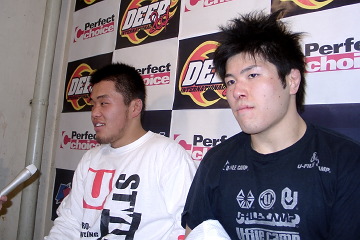 (試合後、言葉を交わしていたが?)『友達になろう』って(笑)。目指すものはもっと上のところだから。日本人同士で戦うのではなくて、もっと世界の頂上を2人で少しずつがんばってやろうって。上山君ももちろん俺と戦うのは、一つのターニングポイントだったと思うけど、まだまだこんなものじゃないですから。仮に俺を倒したって、日本の中のことだからさ。俺も今日はかなり喜んだけどね。でももう今の時点では終わったので、今度は世界を目指す2人で。 (今度はUFC?)出たいですよ。だから上山君もPRIDEとか噂されているけど、上山君はPRIDEでもいいし、2人で世界を目指して、木口道場に一緒に行って、木口トレーニングをやったりだとか。そういうふうにして。彼の親方の田村選手も俺がポッと出のころ、木口道場に来てね、顔を合わせていたから。田村さんは、コンバットレスリング、サンボをやっていたから。そういう意味で、また2人で、木口先生の所に行って、俺もマッハ道場という拠点があるけど、それはそれで、彼も彼でU-FILE CAMPを拠点にして、あとは色々な経験を積めば、なかなか世界の一流選手とやってもそうは負けないから」 (上山はノーコメント)