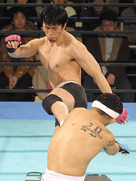 “一人リングスジャパン”を標榜する滑川を血祭りにあげるという宣言は、まだ“対リングス”のリベンジが彼のなかで終わっていないという事を意味するのかもしれない。さらにその返す刀で、渋谷の名前を挙げたのは、去年8月大阪で、打撃戦の末の記憶喪失という不名誉な内容に終わった渋谷とのあの試合を、決して忘れて居なかったという宣言ではないか。おそらく、この二つのリベンジマッチこそが郷野の“幻のマイクアピール”の内容であったにちがいない。