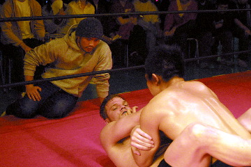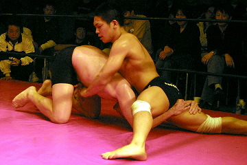 今度はハスが強引にフロントスープレックス気味に投げ、スープレックス・ポイントを取り返す。素早くバックを取りサイドへ回るが、逆に小林が下から腕を取り、ロック・ポイントを奪う。これは1回転して逃れたハスだがガードポジションを強いられてしまう。 以後、スタンドレスリングでは小林が強さを発揮し、ハスはガードポジションを強いられる場面が目立ち始める。セコンドの桜井“マッハ”速人の指示で下から関節をいろいろと狙うハスだが、小林の固い守りを崩すことは出来ず。緊迫した好勝負はあっという間に10分が過ぎ、小林が僅差でプロ初勝利を上げた。最近はキックボクシングのジムで打撃の練習もしているという小林は、総合ルール進出にも意欲を見せている。