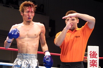 2回、ペースアップし始めた大月が意表をついた左ハイをヒットさせ一気のパンチラッシュ。右フックが当たったところで花戸が左まぶたをカットし、ドクターチェックとなった。「傷が骨膜まで達している」というリングドクターの判断で試合がストップされた。この裁定に場内から失望の声が漏れたが、花戸の傷はかなり広い上に深く、適正な判断であったのは間違いない。とはいえ、1Rのエキサイティングな攻防を目にしたばかりだっただけに、「この打ち合いをもうちょっと見たかった」と会場にいた誰もが思ったことだろう。
