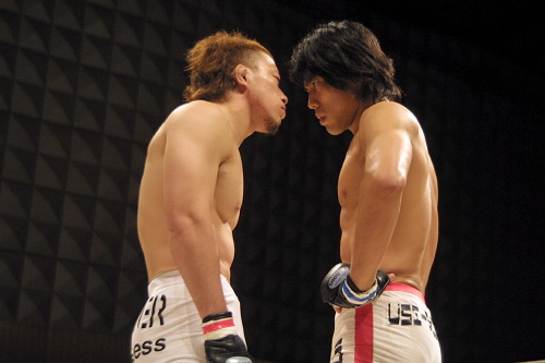◆川尻 「今日は一本取る気は無くて、殴ることしか考えてませんでした。組んで(相手に)力が無いのはわかったんですけど、もつれて万が一にも下になるのは嫌でした。今まではどうしても勝たなければならない試合が多すぎて、打撃戦を避けて戦ってたんですけど、本当は打撃の方が好きですから。 あの試合(デビュー戦)に負けたから今の自分がいます。もし勝ってたら格闘技自体をやってなかったかもしれないです。昔と今の自分は違います。前はアマチュアの気持ちのままでリングに上がっていたけど、今は甘えはありません。俺の方が強い、絶対に勝つ、その気持ちだけです。仲間と妥協しない練習ができているおかげなので、みんなに感謝しています。 今のウェルター級は日本人がナメられているので、これからは外人を一人ずつ潰して行きたいです。『日本は天国だ』なんて言う奴もいるらしいので。 パルヴァーとやりたかったけど、連続KO負けしたので興味が無くなりました。次は昇り調子のハンセンとやりたいですね。 (チャンピオンベルトは狙わない?)日本のウェルターは五味さん一人が背負ってる状態なので、五味さんに認められてから考えたいです。今は僕なんて眼中に無いと思いますから。 (にらみあいについて)あれに乗ってくれたので『絶対倒す』という気持になれました。今まで会場で会ったときもその気持ちを忘れたことは無かったです。ランキングは関係無くて、今日だって青コーナーから入場したいくらいでしたから。」