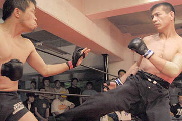野呂のローキック攻勢に、一方的に蹴られまくってしまうタカハシ。いいとこなしのワンサイドゲーム。