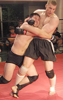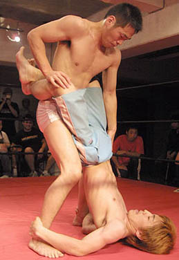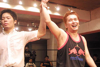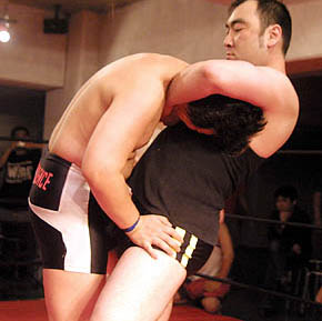 しかし、足の効く達也は薬師寺に攻める暇を与えない。すかさず三角締めで薬師寺の首を巻き込んでしまう。さっきの要領で中腰からの首抜きを狙う薬師寺だが、今回のロックはがっちり食い込んでいて、逆に達也を釣り上げる格好になってしまう。グラウンドへのスラム(叩きつけ)で仕掛けを外そうとした薬師寺だったが、逆にこれがロックを深くする破目になって三角ががっちり極まってしまう。墓穴を掘った薬師寺がタップして試合終了。