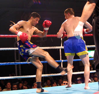 メインイベント UKF世界ジュニアミドル級タイトルマッチ 3分5R ×スティーブ・ホワイト(米国/王者) ○ディビット(真樹ジムオキナワ/MA日本ウェルター級4位) KO 1R2'58"(右ローキック) ※ディビットが新王者に。ホワイトは初防衛に失敗。 3月大会でMAスーパーライト級王者・井上哲(山木)をノンタイトルで破った沖縄在住のアメリカ人ムエタイファイター・ディビッドが、その勢いを駆って挑戦した世界タイトルを見事KOで獲得した。 前日日本に到着したばかりだと言うホワイトはラフなパンチで前進するが、ディビッドはこれを冷静に見切り、ハイキック、ローで威圧。ホワイトの苦し紛れのバックブローにも対処し、「アメリカの選手だからローが弱いと思った」という作戦通りにローを連打。するとホワイトはもろくも崩れ、10カウント以内にファイティングポーズを取れず、あっさりと王座交代となった。 ディビッドはこれで7戦5勝(4KO)2敗。ホワイトは21戦19勝(11KO)2敗。少々相手に不足があった感はあるが、ディビッドの技術・パワーには確かなものがある。その彼の目標はK-1参戦。「K-1に出るためにキックを始めた」という彼にとって、K-1参戦へ向けていい勲章が出来たと言えるだろう。ちなみに戦いたい選手を尋ねると、須藤元気の名前を挙げていた。