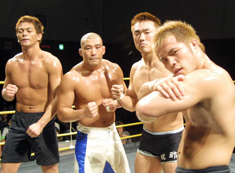 ミドル〜ライトヘビーにまたがった、今“旬”の四人を惜しげもなくグラップリングマッチで勢揃えさせてしまった一戦。それも、現在の格闘技界の情勢では、おそらくこのリングでしか顔合わせすることはあるまいというパンクラス&デモリションJTC同盟vs修斗の組み合わせなのだから、なんともマニア好みというか、人の悪いチーム編成でもある。