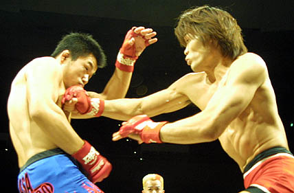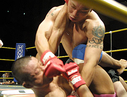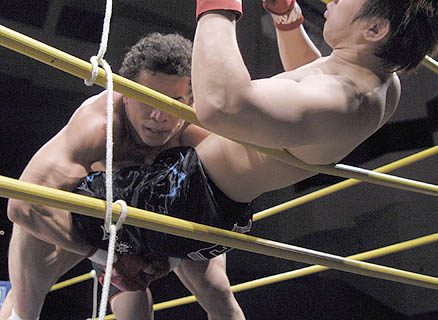 ただプロレスチックなのはここまでで、タッチワークなどは淡泊なもの。相手が変わればこちらも変わるといった感じで、マッハ、國奥にするりと入れ替わってしまう。もともとこの二人は某道場で手合わせもあった組み合わせで手堅いレスリングムーブは、手のうちの分かったもの同志という感触もないではない。
