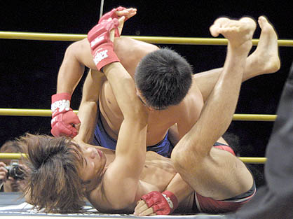 あっという間のスピードで仕掛けられた腕十字こそリフトアップで抜いたものの、かんぬきでパンチを封じた上で、再度三角締めを仕掛けてくるダンテス。その動きは計算され尽したもので、じわじわと有利な形を作り上げ、気が付いたときには辻の動きを封じてしまっていた。腰を浮かして腕をぬこうと踏ん張る辻の頭にパンチを叩き込み、取ったアームを自由にコントロールする動きは力強く無駄が無い。ダンテスの顔面に足をかけてなんとか仕掛けを外そうともがく辻。しかし、その動きをそのまま利用して上下を入れ換え、マウントからパンチを落とすダンテス。ブリッジで上下を入れ換えた辻だが、締めはがっちりと辻の首を捕らえて離さない。逆に腕を取り直して、下からの三角を完成させる。前転で逃れようとする辻の動きは、逆に自分の腕を伸ばしきってしまう形になってしまったのだった。