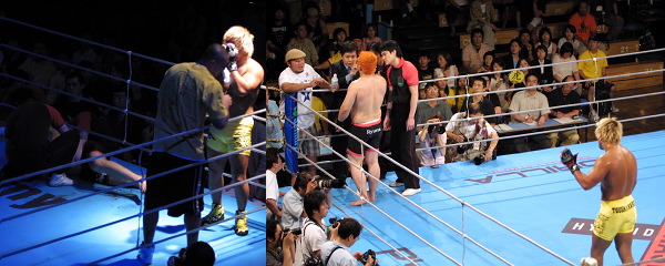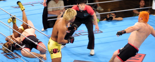 黄色のコスチュームに金髪。トラキチで知られる高橋は、今年の阪神タイガースの快進撃にあやかり、頭からシューズまで全て黄色で統一してきた。対する小澤の髪の色はオレンジ。ジャイアンツを意識したのだろうか? 因縁の対決ムードに火がつく。