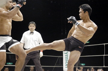 1R開始のゴング。スタンドでの攻防で幕を開けた。ボーゾーはオープンでの構え、警戒するペケーニョは固めのガード。案の定ボーゾーがパンチを狙って行く。するどいキックも見せる。ボーゾーを中心にペケーニョが時計回りにぐるぐると動き続ける。なんとも言えない緊張感が会場を包む。打ち込むボーゾー、ガードするペケーニョ。 2分過ぎ、今度は反時計回りに周り始めるペケーニョ。時折両者パンチを試みるものの一定の間合いを保ったまま、形勢に大きな動きは無い。一発を狙うボーゾーと見切りながらまたしても時計回りに動くペケーニョ。静まり返った会場。異様な雰囲気のまま1R終了のゴングを迎える。これは王者の作戦なのか? 不気味な感じさえする。 続く第2ラウンド。1Rと同様に周るペケーニョ。パンチを入れるボーゾー。時折見舞うキックでペケーニョの左モモは赤くなっている。2分過ぎ、ボーゾーのコンビネーションが決まりかける。ペケーニョの表情が硬い。打撃を恐れているように見受けられる。徐々に距離をつめ、一緒に周りはじめるボーゾー、中に入って行きたいところだが、ここでゴング。 ここまでスリップすらなく、スタンド、しかも数発のバンチ&キックのみでくるくると二人の外国人がリングを周り続けるという異様な展開。しかしその緊張感が伝わっているのか、会場からブーイングは発生しない。