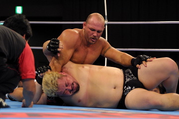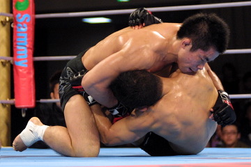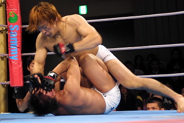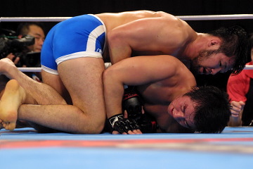 1R、和田の深いタックルが決まってテイクダウン、サイドポジションを狙いながら右パンチを的確に小沢の顔面に打ち込んでいく。アームロックは不完全、終盤パンチの乱打。2R、和田がタックルを再度決めて上になる、時間までパンチのラッシュ。