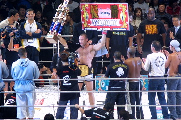 ◆ ダンヘン「もっとタフな試合になると予想していた。15分、フルで戦い抜いて最後は判定になるくらいに。ブスタマンチはテイクダウンを狙ってくるだろうと予想していたので、自分はできるだけスタンドで勝負しようと思っていた。最終的な決め手はパンチのラッシュ。きっかけはブスタマンチがタックルに来たところに自分の左膝がヒットした瞬間だと思う。 (次に戦いたい相手は?)特に具体的に誰ということは考えていない。かねてから桜庭とも戦ってみたいと希望しているが、お互いの契約の状況がわからないので。できれば、GPのチャンピオンと、ミドル級のチャンピオンベルトをかけて戦いたいと思っている。 (リザーブマッチだったが?)準決勝を終えた時点で各選手とも怪我も無く、自分の出場の可能性はないと思っていたので、ワンマッチとして戦った。 (膝の手術後の調子は?)100%ではないけれど良好。今日、この左膝で勝利をつかめたので良かったと思っているよ。」
