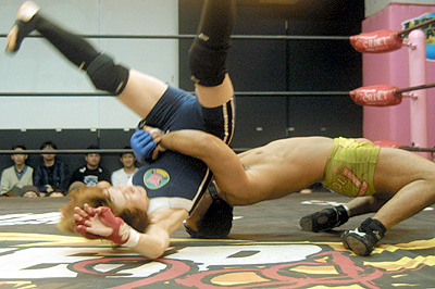 共にマスクで登場ながら、辻の正統派ルチャマスクに対して、三島のそれは蝋人形風の気味の悪いもの。場内は「え〜?」との拒否反応。場内の追い風ムードを背に三島お得意のかに道楽ポーズを決めて見せる辻。 両者、素顔に戻ってのエキシは辻がいきなりラリアットを狙う「お約束」から始まり、バックを取った三島がジャーマンで投げるというプロレスチックなオープニング。しかし、展開が進むと辻が電光石火の飛び付き十字を見せると、三島も負けじと飛び膝をくり出すなど、華麗な技の共演となる。U-STYLEもかくやという“回転体”の攻防となったが、男女エキシということもあり、全て辻に決めさせる形で華を持たせる三島。一本目腕十字、二本目ヒザ十字、三本目に至ってはコブラ固めを繰りだすなど、サービス精神満点の構成で会場も十分温まった。
