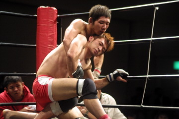 和製カレリンとの異名を取る井上と、元キックボクシング王者の港との試合は、典型的な組技対打撃の構図。RJWに頻繁に出稽古をしている新日本プロレスの中邑真輔も、4日後のDynamite!!でのイグナショフ戦の参考材料にするつもりか、この試合を観戦していた。偶然か必然か、井上×港も中邑×イグナショフ同様の展開に。ストライカー・港の膝やミドルをかいくぐり、井上がタックルで上になり、膠着するという一連の流れが繰り返される。だが10kg以上重いイグナショフと対戦した中邑と違って、契約体重制での試合となる井上は持ち前の組技テクニックを発揮することに成功。サイドポジションをキープしてアームロックを狙ったり、2度水車落としで港を頭からマットに落とすなど、しっかり見せ場を作り、判定勝ちをおさめた。