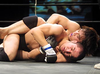 続く2R。気持ちの上でのビハインドを跳ね返すように、飛び膝の奇襲に出た中村。しかしがっちり受け止めた佐藤はそのままタックルでテイクダウンを狙ってくる。だが、ピンチになるほど引き出しの増える男中村は、そのクラッチした腕をとってアームロック狙いからバックに回り込んでのスリーパーと、佐藤の闘志の裏をかく関節攻撃で切り返しを図る。だが締め上げられながらもサイドターンで切り返し、上のポジションとなる佐藤。このあたり、先月の試合中止の原因となった膝の怪我を引きずって「練習不足でした」とうつむくばかりの中村と、正月返上で練習漬け状態だったという佐藤の差が浮かび上がった気がする。粘っこいレスリングの強さは、やはり練習量に比例するからだ。バックを制した佐藤は、転がりまわって逃げる中村の背中に、バックマウントで張り付いてパンチを落とし続ける。ラスト10秒。決死の切り返しで足を取った中村だが、結局タップを奪うことは出来ずゴングを聞くことになった。
