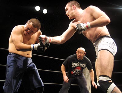 さて本編だが、タックルに徹するNUKINPO!に対し、takinpo?(と呼ぶのが面倒くさいのでJ太郎呼ばわりするが、派手な毛のあるほう)がこれを潰してパンチを叩き込む展開が目立った。2R終盤にはJ太郎がバックマウントを取ってスリーパーを狙う絶好のチャンスを得ながら、逆にメクラ打ちのバック鉄槌を食って決めそこなうなど、トホホな展開もあり判定へ。スタンド、グラウンドともに力量には相当差があるように見えたが、それで一本決着にならないのはいかがなものか。