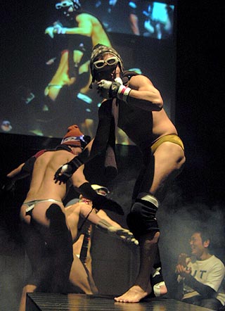 今日のテーマは「冬」とのことで、BGMは「東京ラブストーリー」(例によってカラオケボックスで収録のチープで聞き取り不明の寸劇(?)がカブッたもの)ニットキャップにスキーグラスを付けての入場は、スキー場をイメージしたものと思われるが、いつもの捲りあげTバックで生っ白い尻を突き出しての滑降ポーズに、客席は唖然、騒然、憮然の表情に分かれる。そんなことは知ったことかと、先頭のJ太郎、いやtakinpo?とJボーイズは恍惚の表情で花道狭しと踊りまくり、会場の温度を氷点以下に引き下げた。いや、まさにテーマは「冬」。
