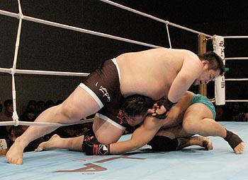 開始2分にしてピンチに陥った前田だが、バックから回されたソッカの腕を取って横ターンに成功。脱出に成功する。立ち上がった前田はすかさず攻勢。アリ猪木状態になるとMMA初戦のソッカと前田のキャリアが逆転する。確実にモモにローキックを打ち込み、フットスタンプも落とす前田。赤く腫れたモモを手で押さえつつ、グラウンドに転がされたカメのようになりながら、前田の顔面を狙って足を跳ね上げるソッカ。