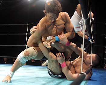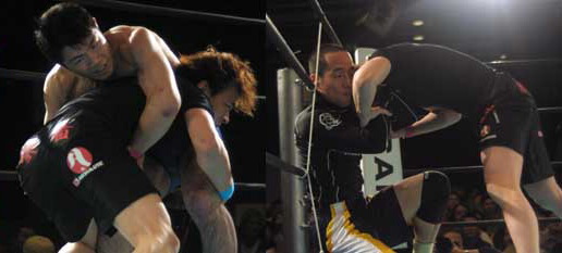 しかし、二回戦ともなると、パンツに「膠着」の二文字を刻んで、老獪な押さえ込みに徹する佐藤が、花くまのトリッキーな動きを封じて、着実に決勝へコマを進める。一方、足の効きを武器に、確実なポジションワークで勝ち上がった代官山。決勝は2Rで行われたが、相手をコーナーに貼り付け、徹底して相手の持ち味を殺す佐藤が、消極イエローカードをものともしない“ブラックホール”ファイトで優勝を飾った。