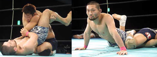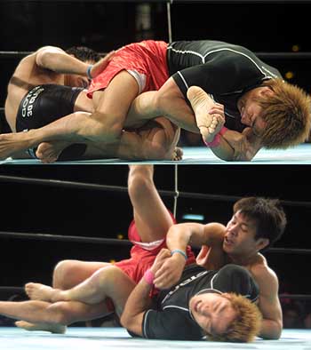 ZST-GP開幕戦での痛恨の敗退から、3ヶ月。大石にとっては待望の再戦となったこのカード。リベンジを期して乗り込んできた大石だが、飛び付きを多用、グラウンドでも次々攻め手を止めない所の豊富な運動量に、後手に回らざるを得ない大石。抜けても抜けても、腕十字、ヒザ十字、アキレス、アンクルと、飽く事なく次々にアタックを繰り返す所の“若さ”が局面を切り開いていく。対する大石はようやく終盤になって、組み崩したところからバックを突いてのスリーパーを仕掛けるが、これも決まらず。
