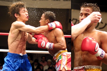 ダーオプラスックのコンビネーションに苦戦の童子丸。2R終盤からは肘の集中打で攻め込まれる。だが3R開始早々、ダーオプラスックの肘に童子丸も肘で応戦。これが見事ダーオプラスックの額を切り裂き、逆転勝ちとなった。